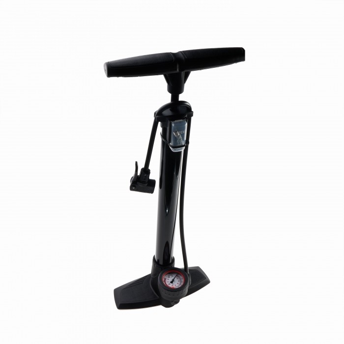 Pompka stacjonarna z wężykiem zakończonym uniwersalną końcówką przystosowaną do wszystkich typów zaworów (AV/DV/FV). Korpus wykonany ze stali i tworzywa. Ergonomiczna rękojeść pokryta miękką gumą. Maksymalne ciśnienie 8 barów, manometr wskazówkowy o wielkości 50mm. W zestawie końcówki do dmuchania materacy i igła do pompowania piłek.
